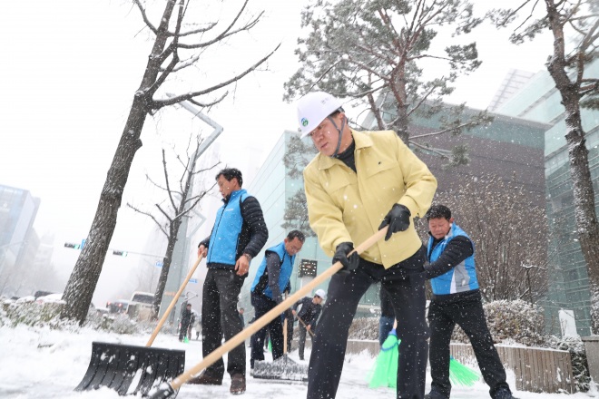 13일 오전 박준희 관악구청장이 직원들과 함께 넉가래로 관악구 청룡동 도로의 눈을 치웠다.
