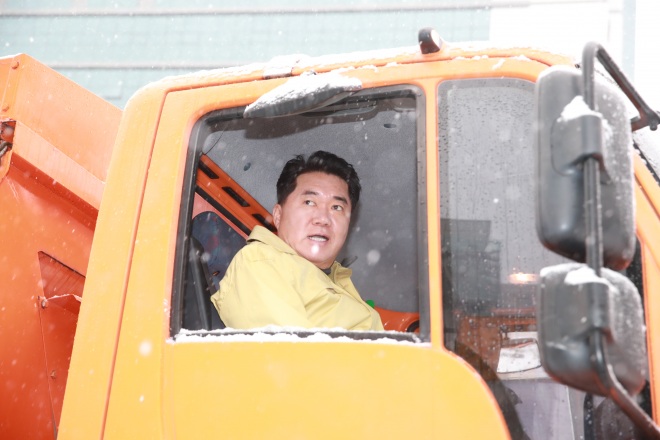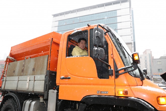 눈이 많이 내린 13일, 박준희 관악구청장은 제설차량 유니목에 탑승해 염화칼슘 살포 작업에 나서는 등 제설 작업에 함께 참여 했다.