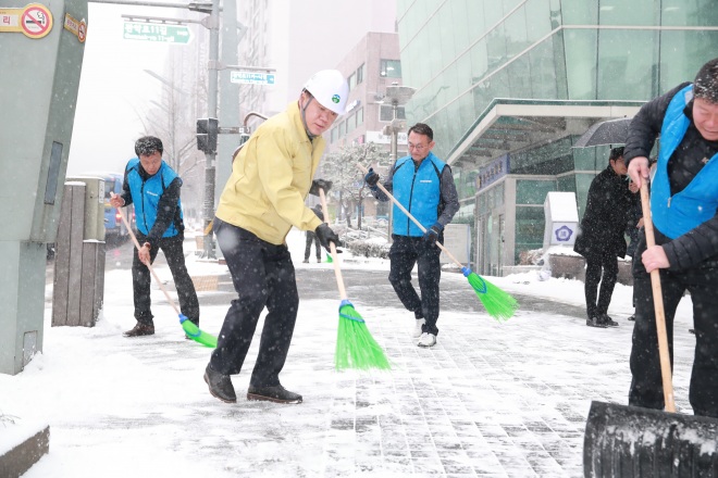 박준희 구청장이 빗자루를 들고 관악구 청룡동 도로에 쌓인 눈을 쓸고 있다.