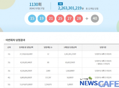 [뉴스카페]27일 추첨한 동행복권 1130회 로또6/45 1등 당첨자는 12명으로 1인당 22억6,330만원씩의 당첨금을 받는다.