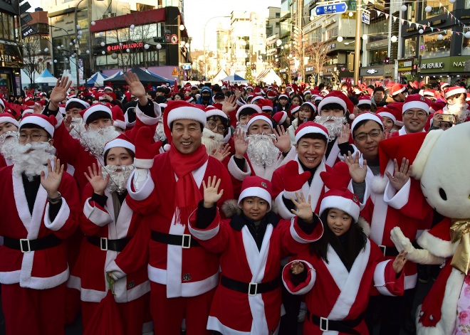 <사진 2> ‘2018 신촌 크리스마스 거리축제’ 사흘째인 24일 오후 신촌 연세로에서 ‘사랑의 몰래산타 대작전’ 출정식이 열린 가운데 산타 복장을 한 문석진 서대문구청장(앞줄 왼쪽 세 번째)과 자원봉사자들이 손을 흔들어 보이고 있다. 이 축제는 성탄절에도 오후 1시부터 8시까지 열린다.