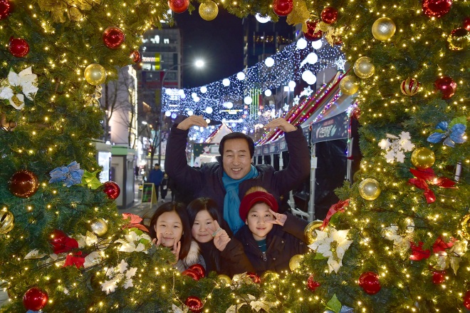 <사진 3> 크리스마스이브인 24일 ‘2018 신촌 크리스마스 거리축제’에 참여한 어린이들이 연세로에 설치된 포토존에서 문석진 서대문구청장과 함께 기념 촬영을 하고 있다. 이 축제는 성탄절에도 오후 1시부터 8시까지 열린다.