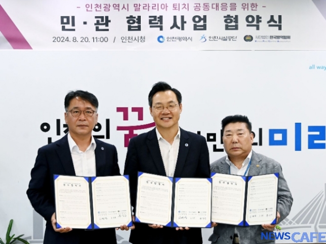 [뉴스카페]인천광역시는 20일 인천시청에서 인천시설공단, 사단법인 한국방역협회와 함께 말라리아 퇴치 공동대응을 위한 업무협약을 체결했다고 밝혔다.