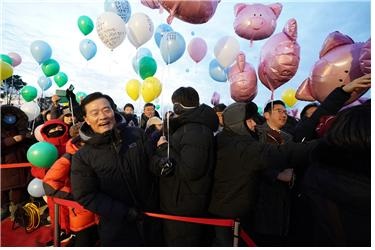 2. 주민 각자가 2019년의 바람을 적은 희망풍선을 바라보며 응원하고 있는 이승로 성북구청장