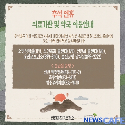추석 연휴 중 문 여는 병·의원이나 약국 정보 129(보건복지콜센터) , 119(구급상황 관리 센터) , 응급의료포털 , 스마트폰 앱 응급의료정보제공 , 옹진군청 홈페이지에서 확인할 수 있다.