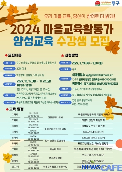 [뉴스카페]인천시 중구(구청장 김정헌)는 ‘2024년 중구 마을교육활동가 양성과정’의 교육 참여자를 모집한다고 19일 밝혔다.