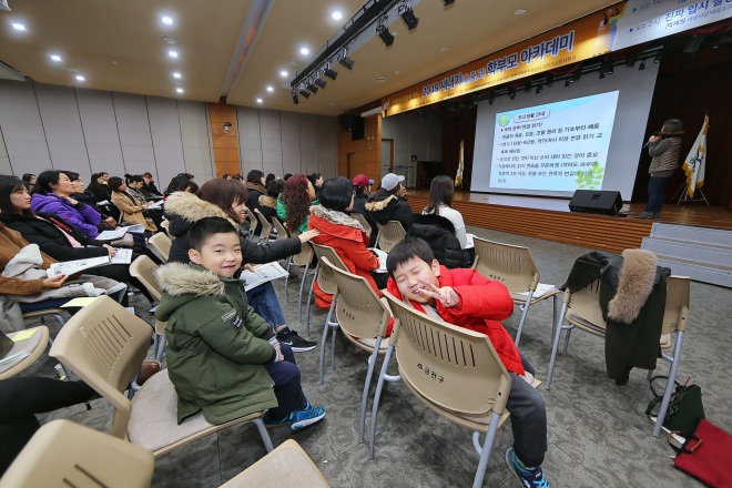 <사진2. 2019년 1월 10일(목) 금천구청 12층 대강당에서 열린 ‘새내기 학부모 아카데미’에서 부모와 함께 참석한 예비 초등학생들이 장난을 치며 즐거워 하고 있다 >