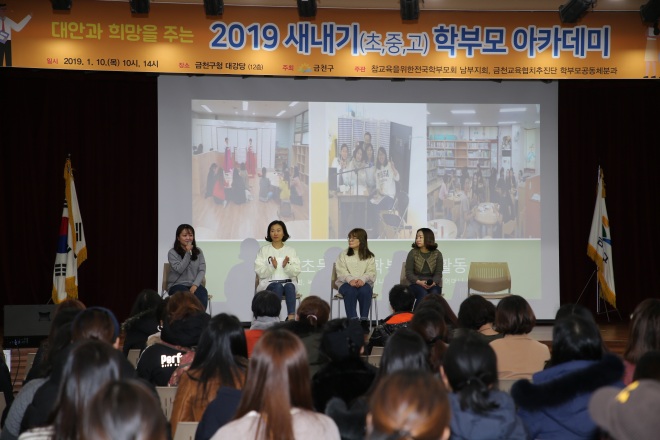 < 사진3. 2019년 1월 10일(목) 금천구청 12층 대강당에서 열린 ‘새내기 학부모 아카데미’에서 선배 학부모들이 예비학부모에게 자신의 경험담을 들려주고 있다 >