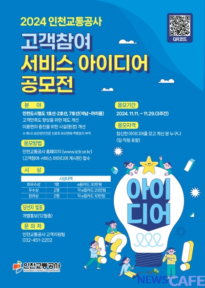 [뉴스카페]인천교통공사(사장 김성완)는 인천 도시철도1.2, 7호선(석남~까치울)을 이용하는 고객을 대상으로 서비스 개선을 위한 시민 의견을 수렴하기 위해 ‘고객참여 서비스 아이디어 공모전’을 개최한다고 11일 밝혔다.