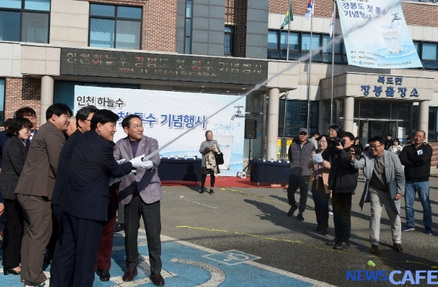 [뉴스카페]인천시 상수도사업본부는 13일 옹진군 북도면 장봉출장소에서 주민과 관계자 등 100여 명이 참석한 가운데 장봉도 첫 통수 기념행사를 개최하며, 신도에 이어 시도와 장봉도에도 인천하늘수가 공급되기 시작했다고 밝혔다.