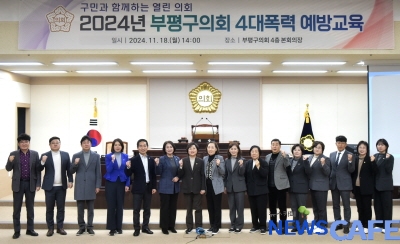 [뉴스카페]인천 부평구의회(의장 안애경)는 지난 18일 직장 내 양성평등에 대한 건전한 가치관 함양 및 안전한 조직문화 조성을 위하여 조우진 중앙경찰학교 여성청소년분야 교수요원을 초청해 의원 및 사무국 전 직원을 대상으로 4대폭력 예방교육을 실시했다.
