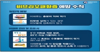 아울러 예방수칙은 어패류 충분히 익혀 먹기, 피부에 상처가 있는 사람은 바닷물과 접촉 금지, 어패류 보관은 –5℃ 이하 저온 보관 및 85℃ 이상 가열처리, 어패류 조리시 흐르는 수돗물에 씻기, 날생선 및 어패류를 요리한 칼·도마 등은 소독 후 사용해야 한다