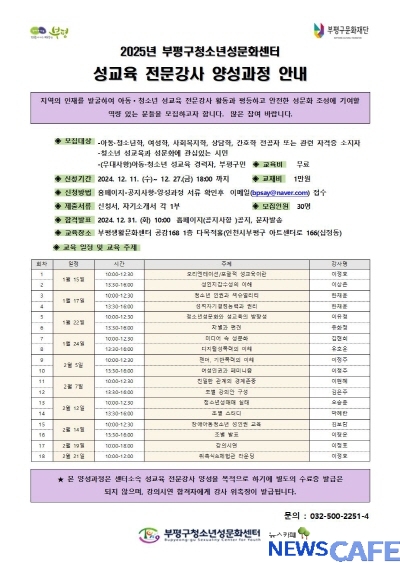 [뉴스카페]인천 부평구(구청장 차준택) 청소년성문화센터는 오는 11일부터 27일까지 ‘2025년 성교육전문강사 양성과정’ 참여자를 모집한다.