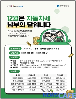 [뉴스카페]인천광역시(시장 유정복)는 2024년 12월 정기분 자동차세(지방교육세 포함) 총 71만여 건, 1,213억 원을 부과·고지했다고 밝혔다.
