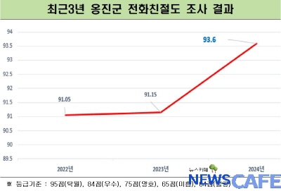 [뉴스카페]옹진군(문경복 군수)은 옹진군 직원들의 2024년 전화친절도 조사 결과 종합점수 93.6점으로‘우수’등급을 기록했다고 밝혔다. 이는 최근 3년 내 가장 높은 점수로 전년 대비 2.4점이 높은 수치이다.
