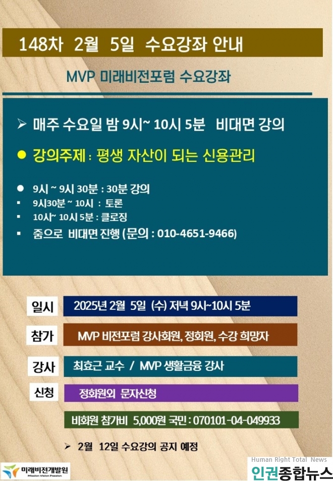 [인권종합뉴스/김윤경 기자] 오는 2월 5일(수) 저녁 9시부터 10시 5분까지 MVP 미래비전포럼 주최로 ‘148차 수요강좌’가 비대면으로 진행된다. 이번 강의의 주제는 “평생 자산이 되는 신용관리”이며, MVP 생활금융 강사인 최효근 교수가 강연을 맡는다.