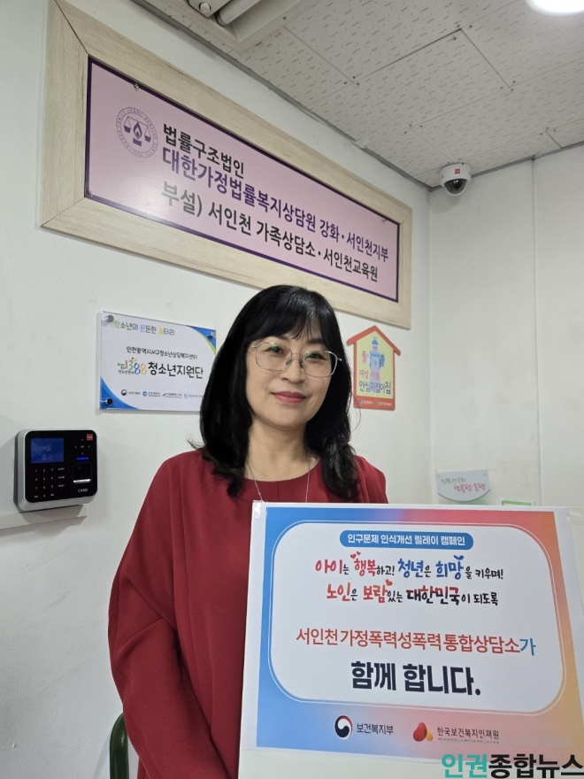 4월 24일, 대한가정법률복지상담원 강화서인천 지부 부설 서인천 가정폭력성폭력 통합상담소(소장 정미희)는 ‘인구문제 인식개선 릴레이 캠페인’에 뜻을 모으며 이러한 메시지를 전했다. 이번 캠페인은 보건복지부와 한국보건복지인재원이 주관하고 있으며, 인구감소와 고령화라는 우리 사회의 구조적 문제를 '사람의 이야기'로 풀어내고자 다양한 기관과 단체들이 함께하고 있다. 서인천 가정폭력성폭력 통합상담소장은 인천 서구청 강범석 구청장에 이어 인천서구가족센터 심정흠 센터장으로부터 지목을 받아 참여하고 있다.