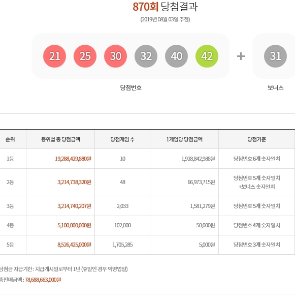 1등 당첨번호는 21, 25, 30, 32, 40, 42. 이며, 2등 보너스 번호는31번이다