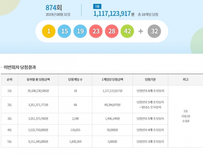 1등 당첨자는 당첨번호 6개의 숫자가 일치한 18명으로 각각 1,117,123,917원의 당첨금을 2등은 5개 번호 와 보너스 번호가 일치한 68명으로 각각 49,284,879원의 당첨금을 받는다.