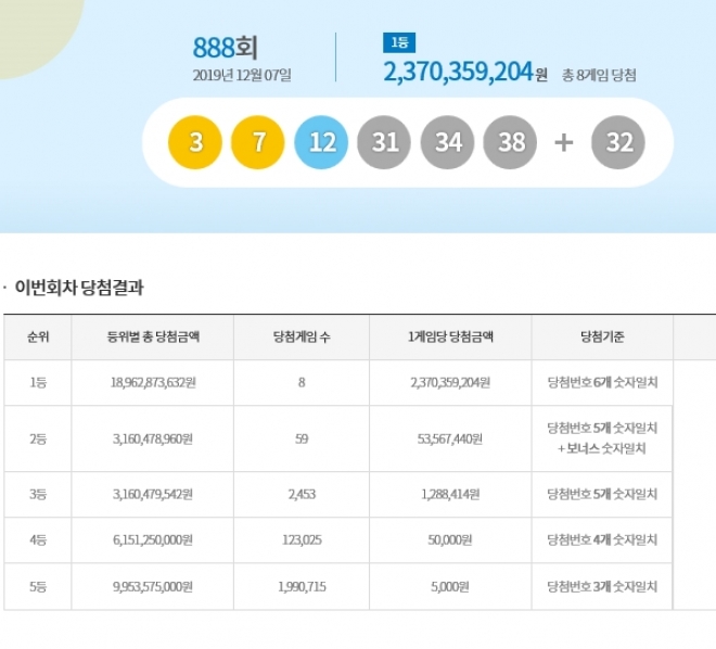 이날 추첨한 888회 1등 당첨자는 8명이다.