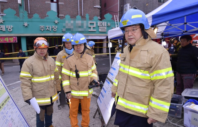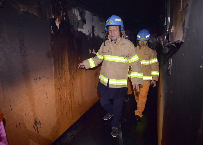 이용섭 광주광역시장이 22일 새벽 발생한 북구 두암동 모텔 화재현장을 찾아 소방 관계자들과 모텔 내부를 둘러보고 있다. / 광주광역시 제공