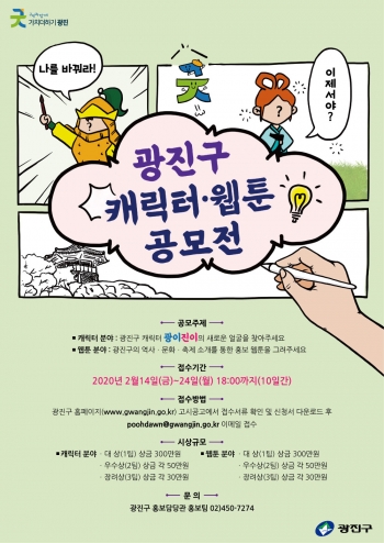 이번 공모전은 기존에 있던 온달장군과 평강공주 콘셉트인 광이, 진이 캐릭터를 최근의 트렌드에 맞게 새롭게 단장하고, 웹툰을 통해 광진구의 역사와 문화, 축제 등 주민생활과 직결되는 생활정보를 쉽게 홍보하기 위해 마련됐다.