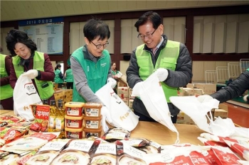 동대문구, 대상(주)과 함께하는 ‘설날 사랑의 떡국 나눔’ 행사에서 유덕열 동대문구청장(오른쪽)이 권용석 상무와 선물꾸러미를 포장하고 있다