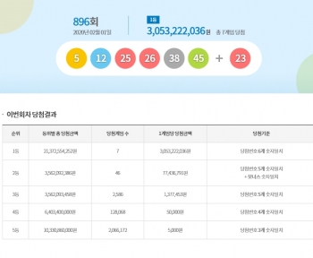 [뉴스카페]1일 추첨한 동행복권 896회 로또6/45 1등 당첨자는 7명으로 1인당 30억5,322만원씩의 당첨금을 받는다.