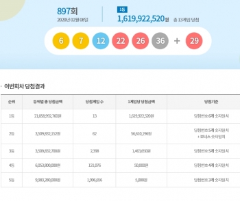 [뉴스카페]8일 추첨한 동행복권 897회 로또6/45 1등 당첨자는 13명으로 1인당 16억1,992만원씩의 당첨금을 받는다.