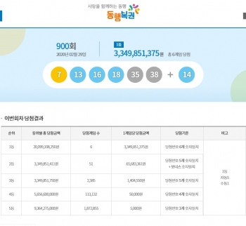 1등 당첨자는 당첨번호 6개의 숫자가 일치한 6명으로 각각 3,349,851,375원씩의 당첨금을 2등은 5개 번호 와 보너스 번호가 일치한 51명으로 각각 65,683,361원의 당첨금을 받는다.