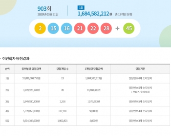 [뉴스카페]21일 추첨한 동행복권 로또6/45 903회 1등 당첨자는 1인당 16억8,458만원씩의 당첨금을 받는다.