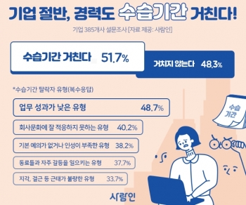 정식 채용 여부를 결정하는 주요 요인이 ‘업무 성과’인 만큼 수습기간 탈락 확률이 높은 유형 1위도 ‘업무 성과가 낮은 유형’(48.7%, 복수응답)이 차지했다.