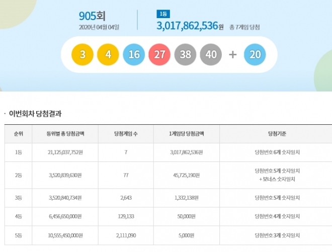 이날 추첨한 905회 1등 당첨자는 7명이다.