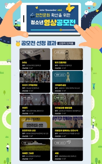 이번 공모전에는 영화, 다큐, 공익광고, 기타 UCC 등 다양한 영상콘텐츠 89편이 접수됐으며 심사를 통해 ‘0416’, ‘잊지 않을게요’, ‘우리가 기억할게요’, ‘기억해주세요’, ‘프렌즈’, ‘안전불감증 예방접종’ 등 10편이 수상의 영예를 안았다.