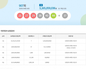 [뉴스카페]18일 추첨한 동행복권 로또6/45 907회 1등 당첨자는 1인당 31억6,505만원씩의 당첨금을 받는다.