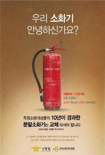 '화재예방, 소방시설 설치·유지 및 안전관리에 관한 법률'의 개정으로 소화기의 내용연수가 10년으로 설정되어 내용연수가 지난 소화기는 새 소화기로 교체해야 한다. 다만 한국소방산업기술원의 성능확인검사를 받아 합격하면 1회에 한하여 3년 연장 사용이 가능하다.