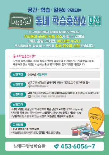 [뉴스카페]인천 남동구(구청장 이강호)는 오는 6월부터 12월까지 남동구 곳곳에서 구민 누구나 근거리에서 원하는 학습을 받을 수 있도록 하는 ‘동네 학습충전소’사업을 추진한다.