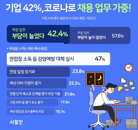 구인구직 매칭 플랫폼 사람인(대표 김용환)이 기업 436개사를 대상으로 ‘코로나 19로 인해 채용 업무에 부담이 늘었는지 여부’를 조사한 결과, 42.4%가 ‘부담이 늘었다’고 답했다.