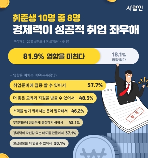 구인구직 매칭플랫폼 사람인(대표 김용환)이 구직자 2,122명을 대상으로 ‘취업준비와 경제력’에 대해 조사한 결과, 81.9%가 경제력이 성공적인 취업에 영향을 미친다고 답했다.