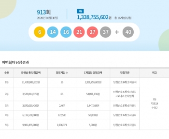 [뉴스카페]30일 추첨한 동행복권 로또6/45 913회 1등 당첨자는 13억3,875만원씩의 당첨금을 받는다.