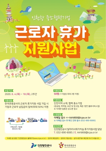 인천항만공사의 ‘협력기업 근로자 휴가지원 사업’은 인천항 협력기업 근로자가 한국관광공사에서 추진 중인 근로자 휴가 지원사업에 참여할 때 부담하는 근로자(20만원)와 기업 부담금(10만원)의 50%를 지원하는 사업으로 관련 사업에 선정되면, 기업 5만원, 근로자 10만원만을 부담하면 근로자는 40만원 상당의 국내 관광상품을 이용할 수 있게 된다.