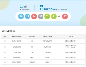 [뉴스카페]6일 추첨한 동행복권 로또6/45 914회 1등 당첨자는 19억5천만원씩의 당첨금을 받는다.