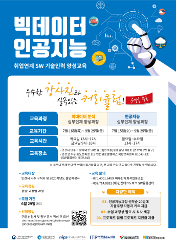 이 교육과정은 과학기술정보통신부와 인천시가 지원하는 SW융합클러스터 2.0 사업의 하나로, 4차 산업혁명 핵심기술인 빅데이터와 인공지능(AI) 전문 인력 양성 및 취업을 지원하는 프로그램이다.