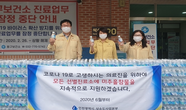 [뉴스카페]인천상수도사업본부(본부장 박영길)는 지난 12일 동구보건소 선별진료소 지원을 시작으로 인천지역 30개소의 모든 선별진료소에 미추홀참물 PET병 350㎖ 6만병을 지원한다고 밝혔다.