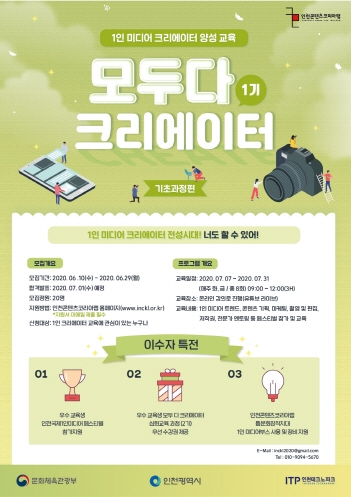 [뉴스카페]인천테크노파크(인천TP)가 운영하는 인천콘텐츠코리아랩은 오는 29일까지 1인 미디어 전문가 양성 프로그램 ‘모두 다 크리에이터’에 참여할 수강생을 모집한다고 21일 밝혔다.