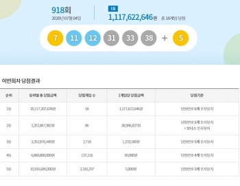 [뉴스카페]4일 추첨한 동행복권 918회 로또6/45 1등 당첨자는 18명으로 1인당 11억1,762만원씩의 당첨금을 받는다.