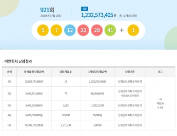[뉴스카페]25일 추첨한 동행복권 921회 로또6/45 1등 당첨자는 17명으로 1인당 12억3,257만원씩의 당첨금을 받는다.