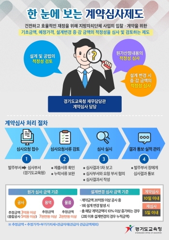 계약심사제도는 경기도교육청이 2012년 전국 교육행정기관 가운데 최초 도입한 것으로 교육행정기관과 공립학교, 공립 유치원이 발주한 각종 공사·용역·물품 계약 체결 전에 원가 산정 적정성을 검토하고 분석해 예정 가격을 결정함으로써 예산 낭비를 방지하는 제도다.