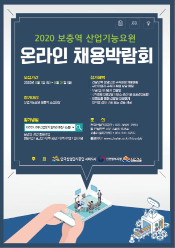 매년 오프라인으로 실시하던 채용박람회를 올해는 코로나19 지역감염 확산 예방을 위해 온라인으로 진행하게 되었으며, 산업단지 일자리 매칭시스템(KICOX JOB)를 통해 참여할 수 있다.