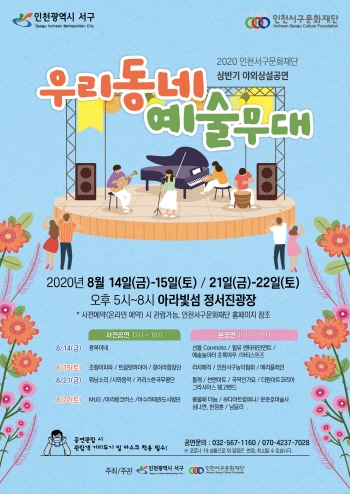 [뉴스카페]인천서구문화재단은 오는14일과 15일, 21일과 22일 정서진에 위치한 아라빛섬 정서진 광장에서 코로나19 극복을 위한 힐링콘서트 형식으로 야외상설공연 ‘우리동네 예술무대’를 진행한다고 12일 밝혔다.